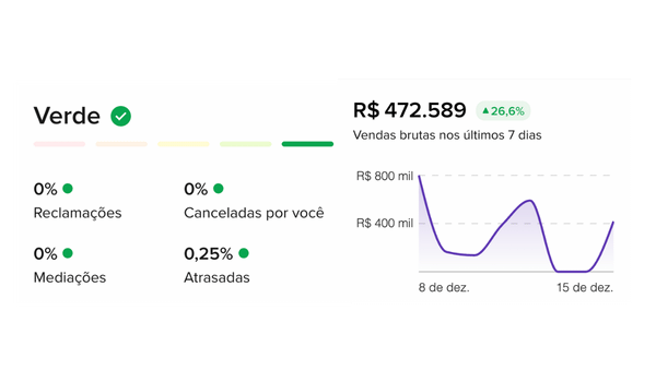No painel de análises, você encontra uma área dedicada às métricas de vendas. Nela, é possível visualizar o total vendido por período.